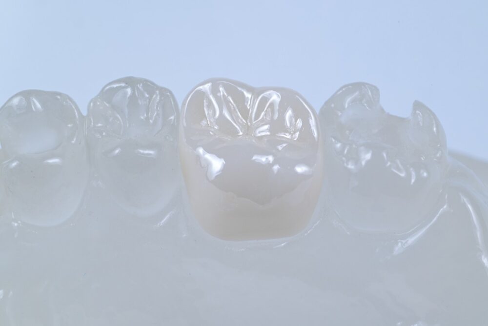 ジルコニアとは、人工ダイヤモンドとも呼ばれるほど優れた強度を持つセラミックです。ジルコニアは噛む力が強くかかる奥歯にも適しています。酸や温度変化にも強いため耐久性も高く、生体親和性にも優れているため金属アレルギーを起こす心配もありません。汚れも付きにくいのでむし歯や歯周病リスクも少なく、適切なメンテナンスを行っていれば、長く使用することができます。
