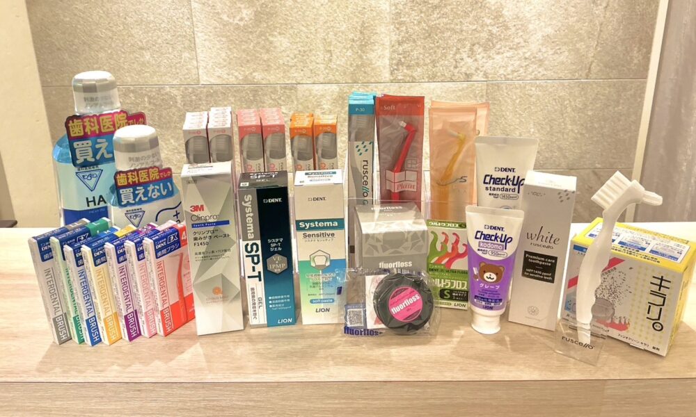 当院では患者様お一人お一人に合わせた歯ブラシや歯磨き粉などをご提案できるように豊富なセルフケア商品を扱っております。受付にて購入可能ですのでご希望の患者様はお気軽に受付へお申し付けください。